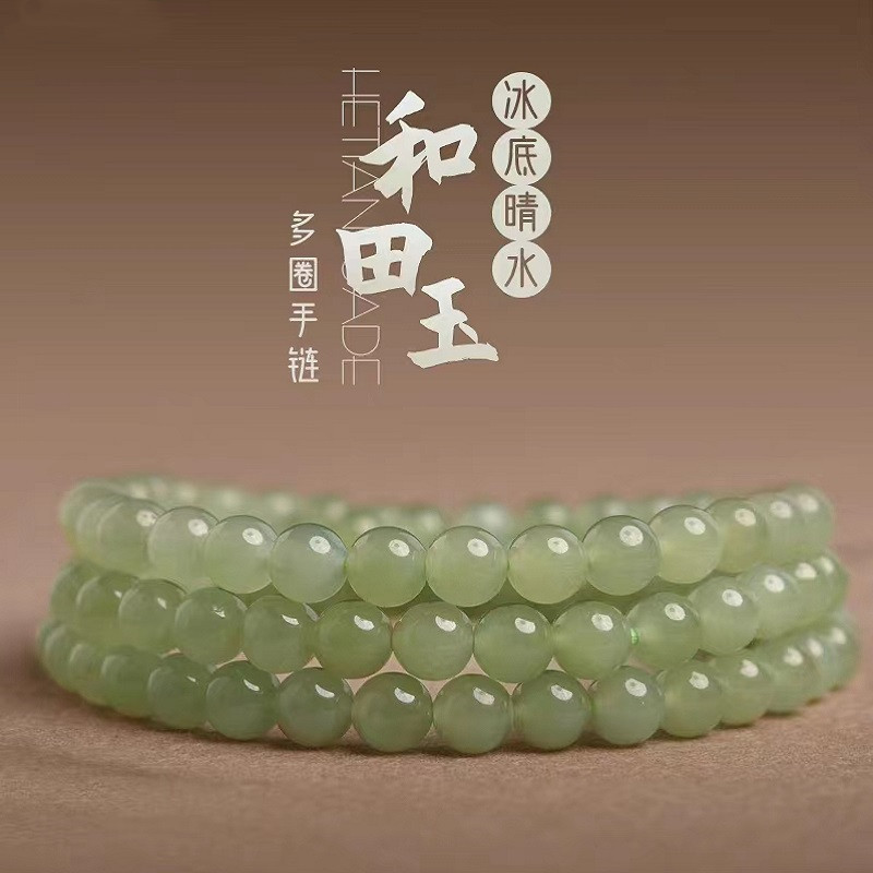 天然新疆和田玉散珠青白玉円珠晴水緑手串羊脂玉ブレスレット男女碧玉手串