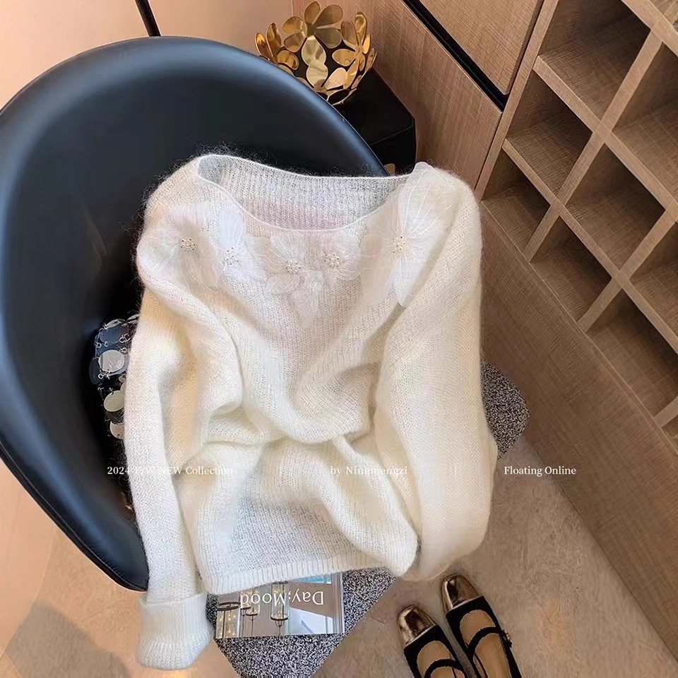 温柔风花朵钉珠白色仿马海毛毛衣女2025秋季新款轻懒软糯针织衫