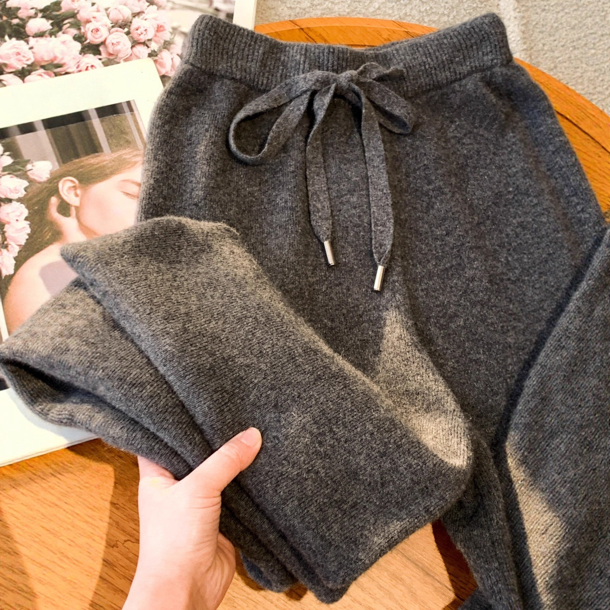 秋冬加厚柔软爆款穿搭仿羊绒裤女针织阔腿裤仿羊毛直筒灰色裤子