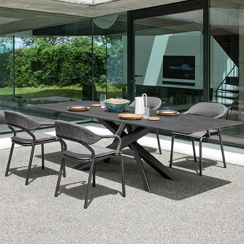 北欧の屋外の縄編みのテーブルと椅子の別荘の庭の室外の藤の椅子の露店の防水の岩板の大理石の食卓と椅子