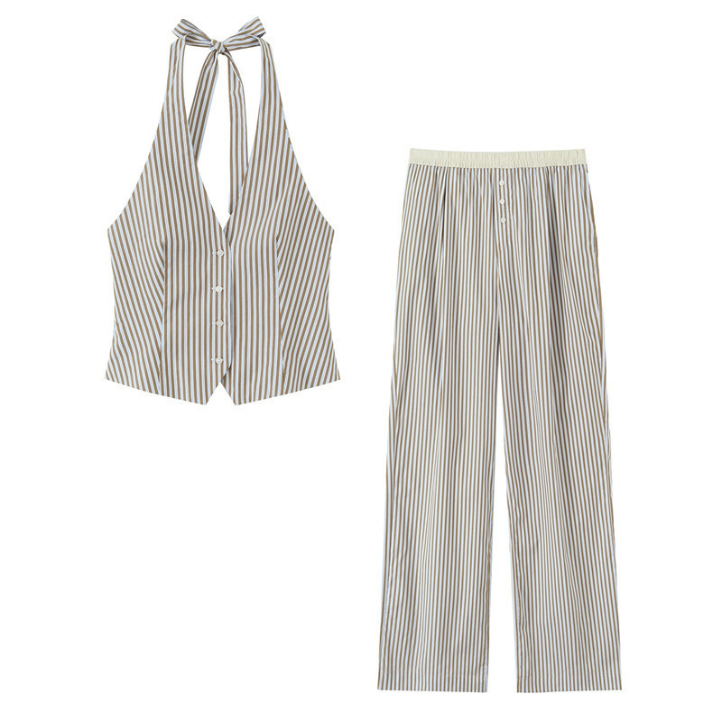 ヨーロッパとアメリカのクロスボーダー婦人服卸売女性のシルクサテンの質感のホルターネックトップとワイドレッグパンツ