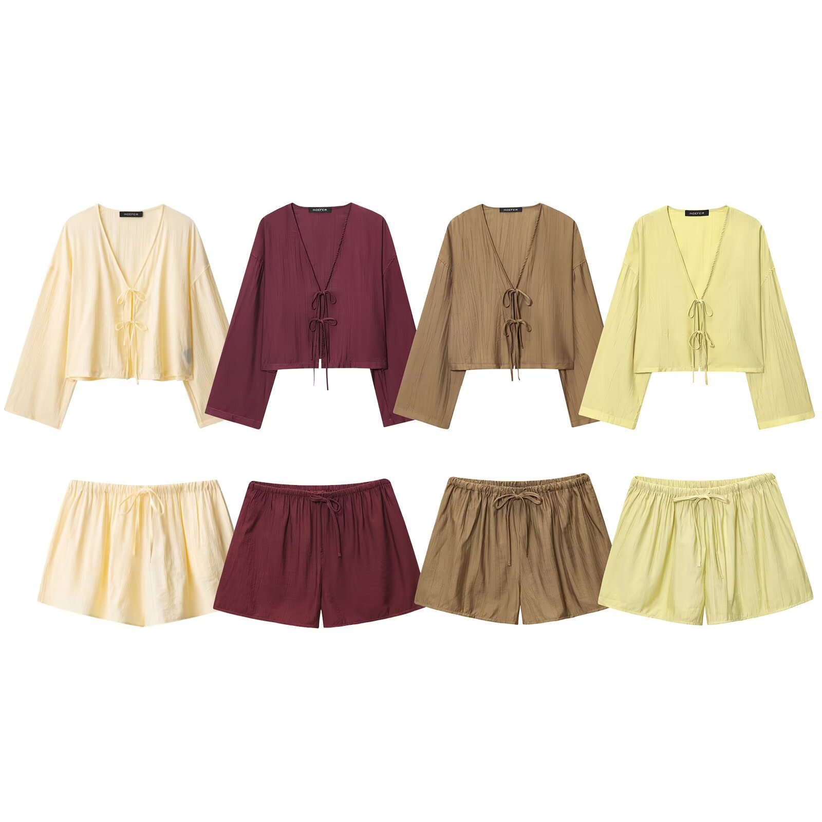ヨーロッパとアメリカのクロスボーダー婦人服卸売女性のしわ効果着物スタイルのアウターハイウエストショーツカジュアルスーツ
