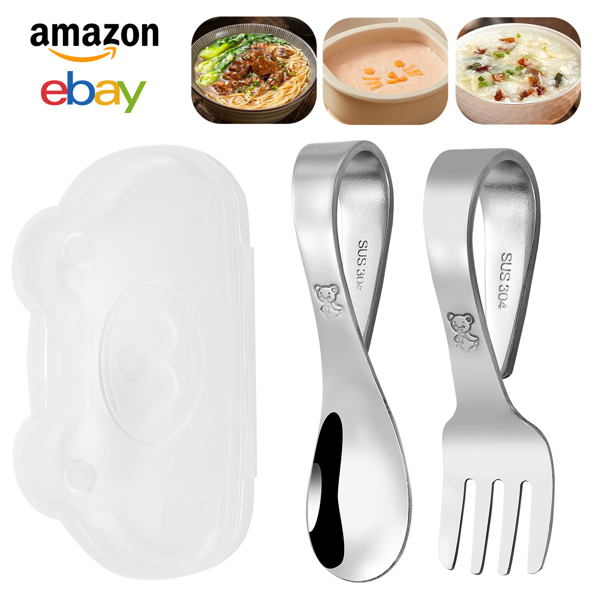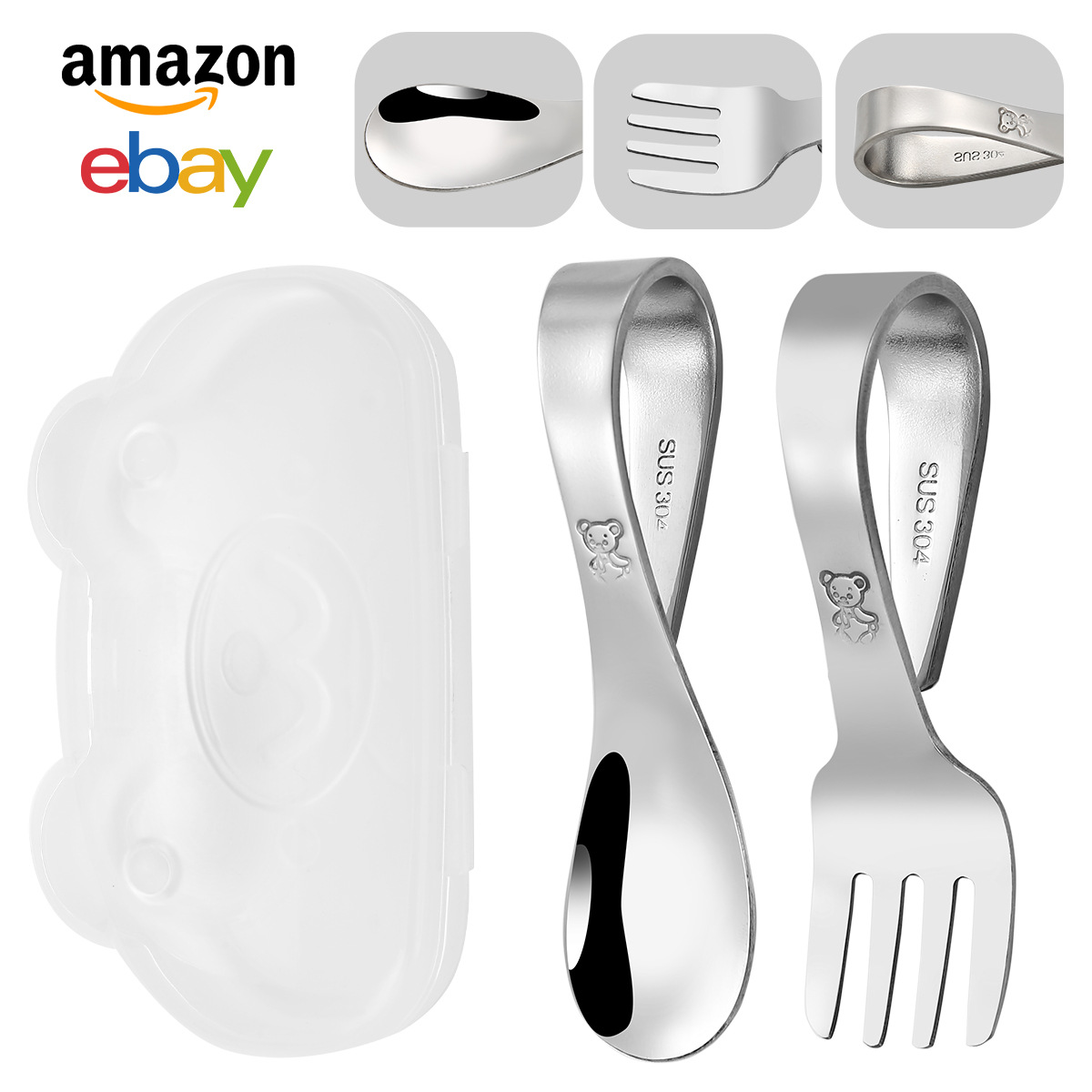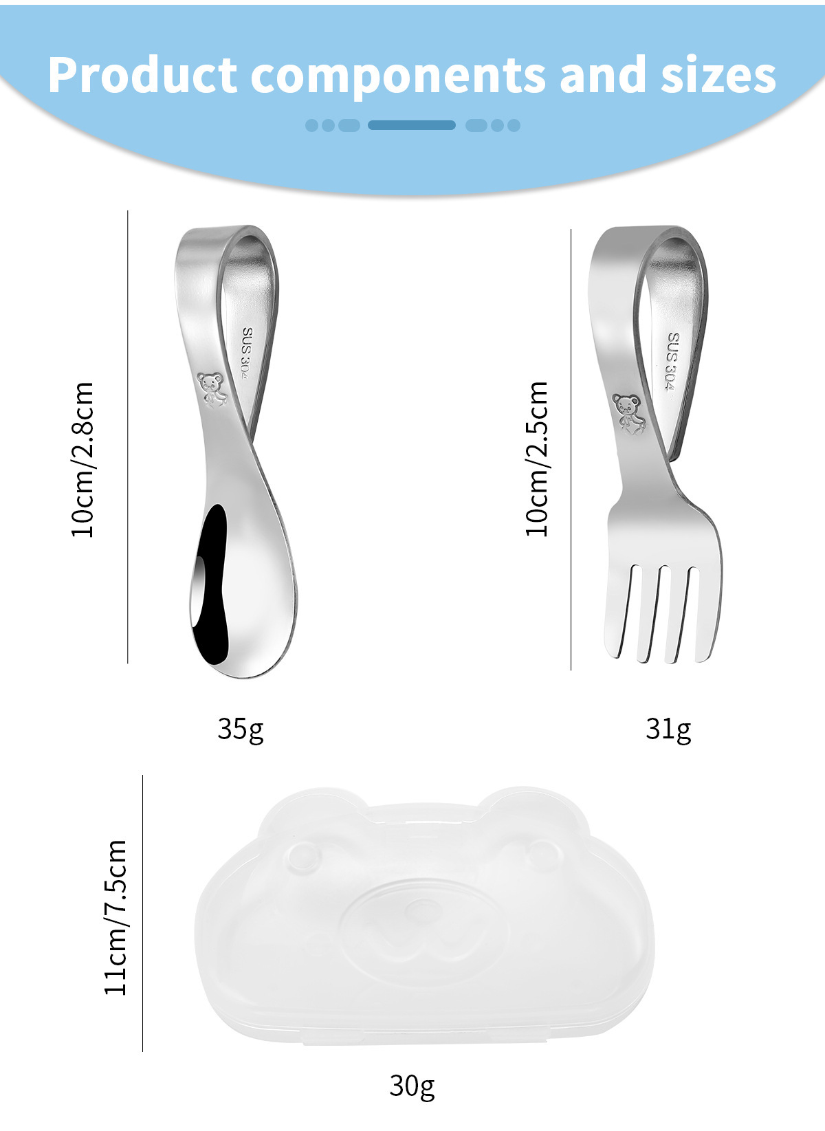 クロスボーダー304ステンレス携帯子供食器セット幼児スプーンフォーク収納ケース付き曲げ柄赤ちゃんトレーニングスプーン