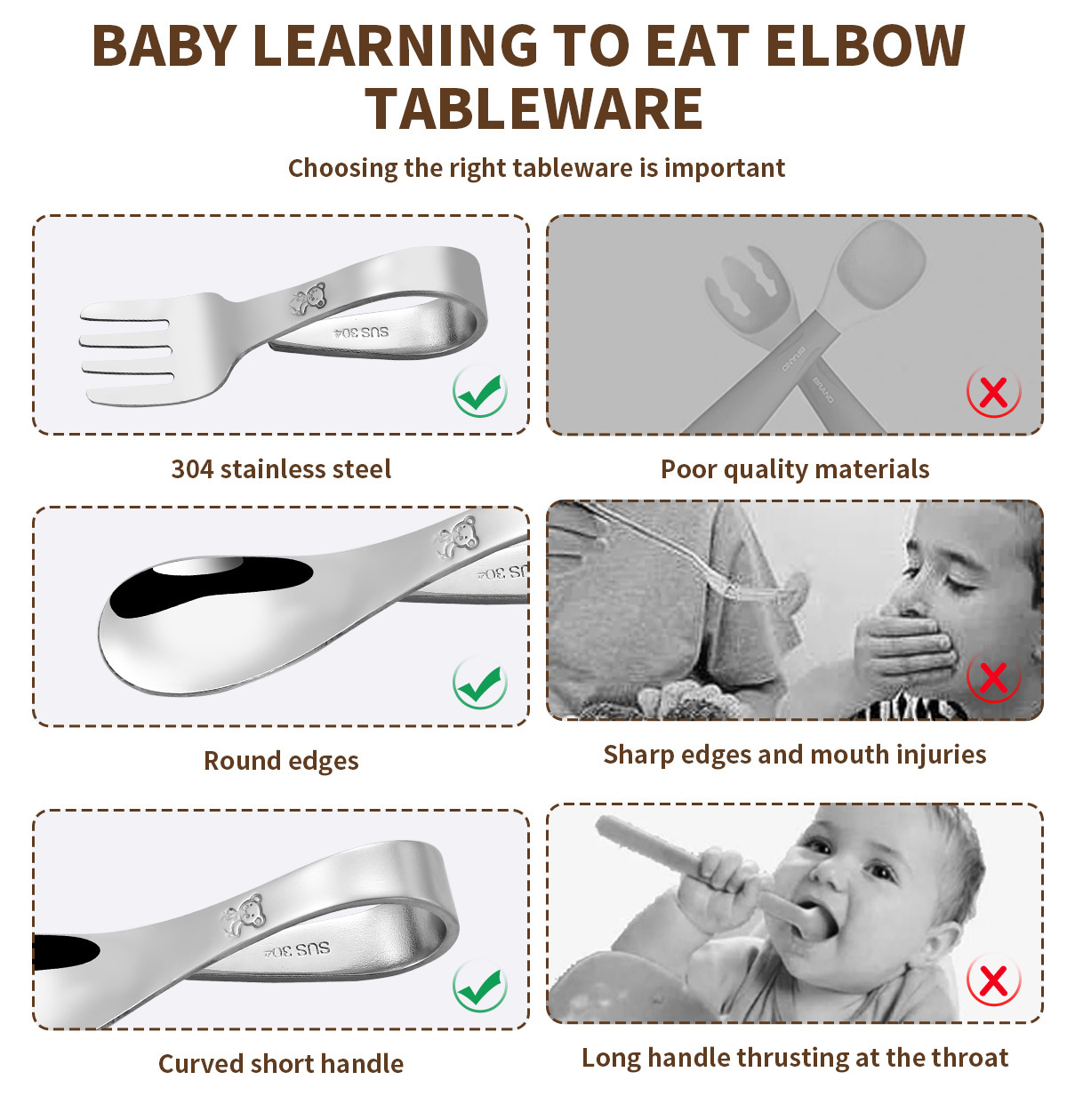 赤ちゃん304ステンレススプーンフォークセットシリコンハンドルトレーニングスプーン曲げスプーン補助スプーン外出携帯赤ちゃん