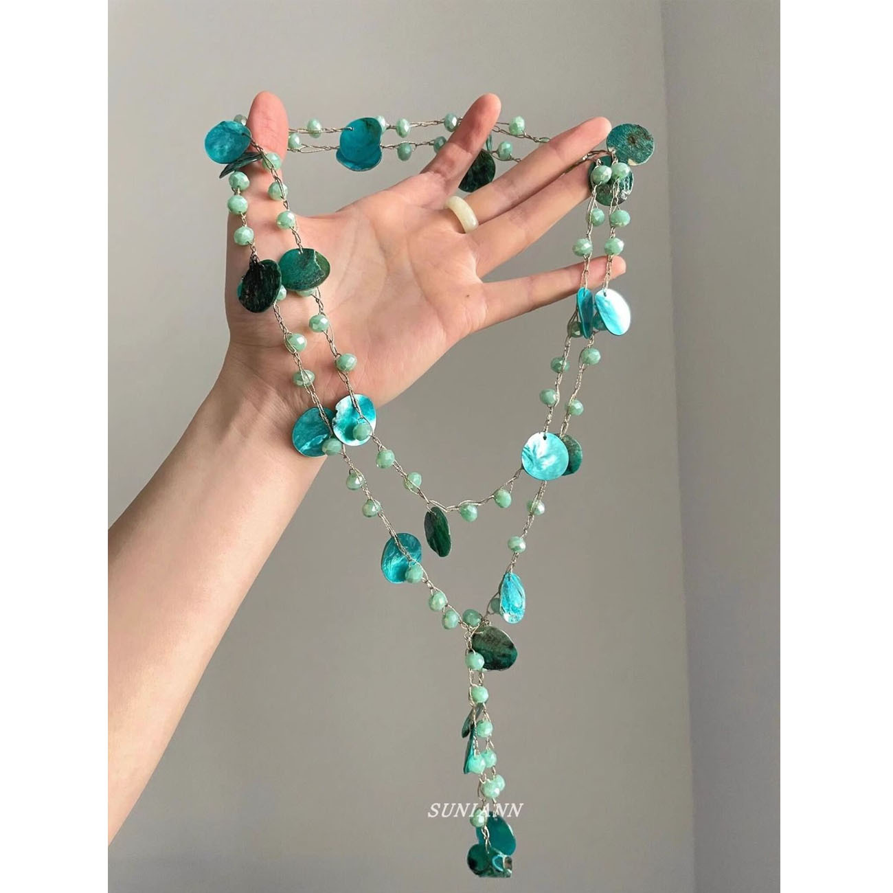 复古小众天然绿色贝壳项链波西米亚民族风长款双层叠戴欧美毛衣链