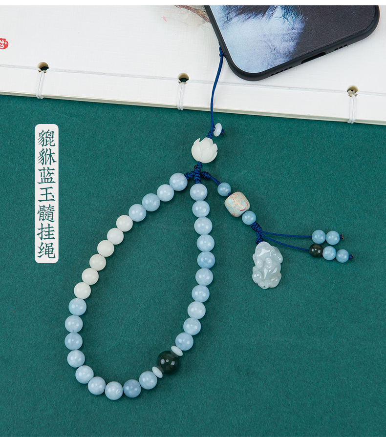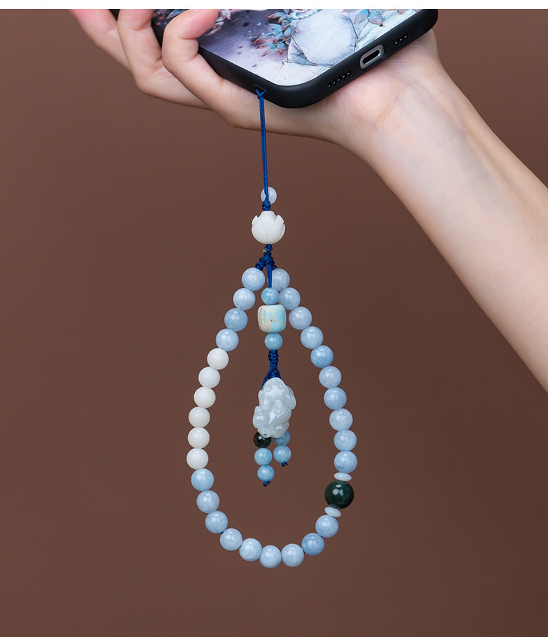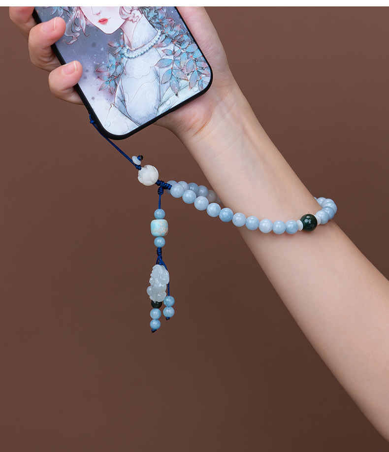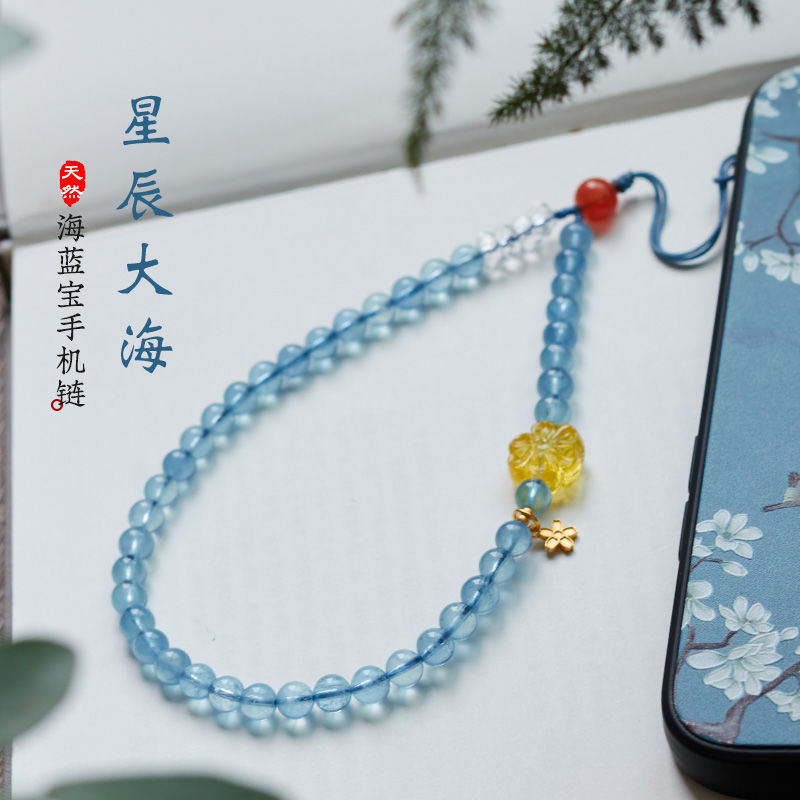 天然海藍宝携帯チェーン琥珀花手作りビーズ紛失防止携帯ストラップ清新少女オリジナルストラップ