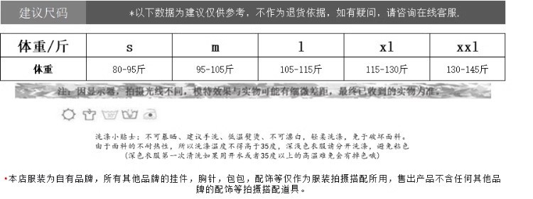 关于色差:衣服颜色由于拍摄器材、天气、光线以及电脑或者手机/显示器不同都会出现轻微色差,均属于正常现象避免不了哦,以收到的实物为准。色差不属于质量问题或者是描述不符;不能以此理由为退货条件;能接受再拍哦;拍下即为认可。