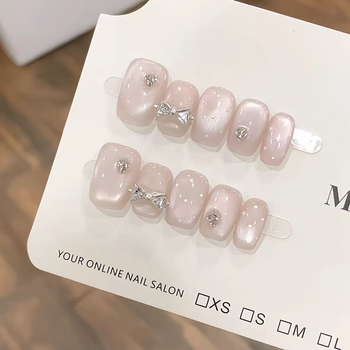 『蜜桃の女の子』春夏新作蝶結びガラスビーズ猫眼純手作りネイルシールシンプル