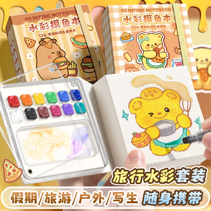 旅行便携户外写生手账本调色画板套装迷你水彩颜料盒摸鱼集绘画本