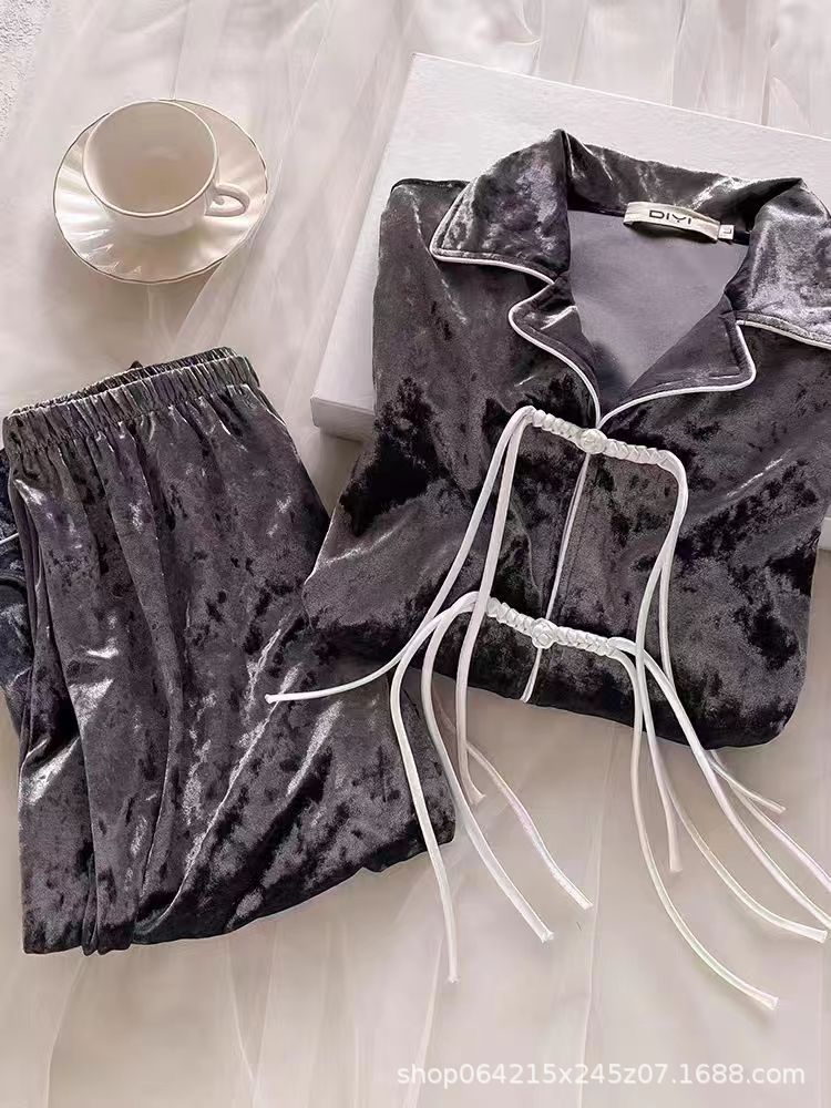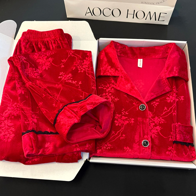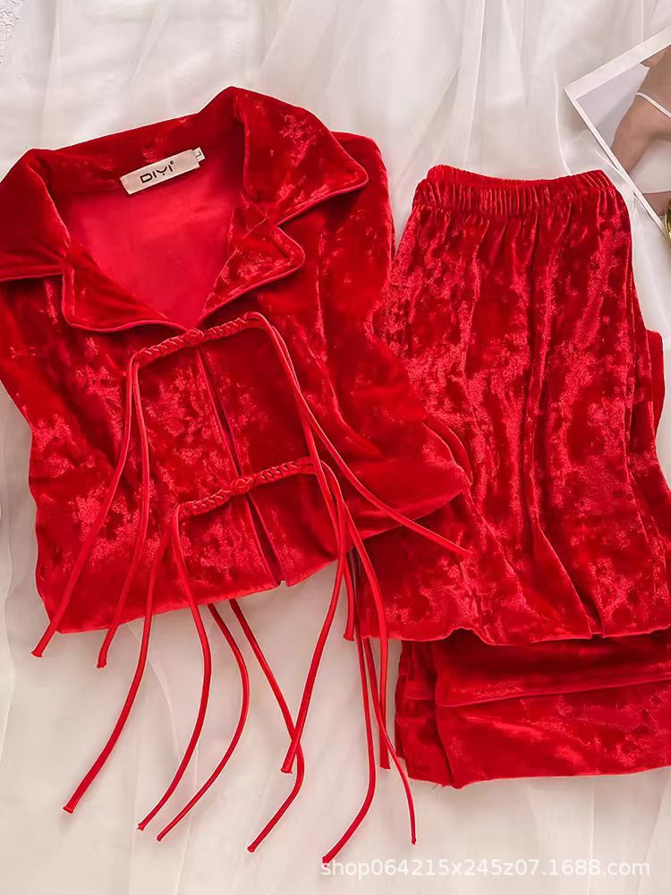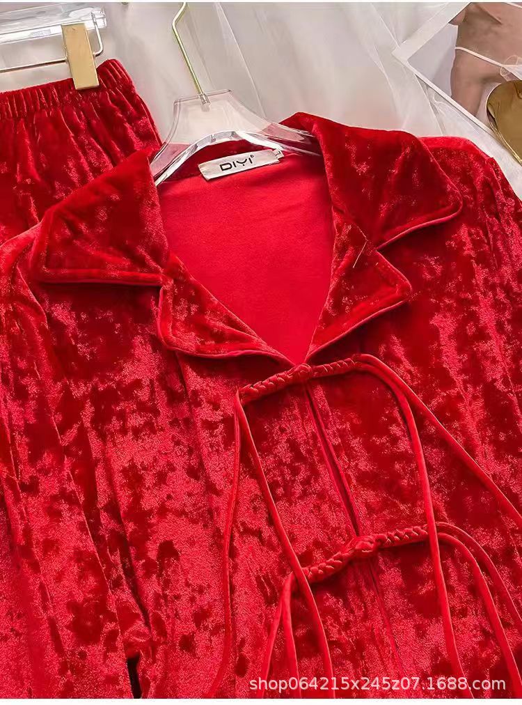 新型ベルベット中国式国風甘いパジャマ女性春秋冬金ベルベット家庭服セット赤金ドリルパジャマ