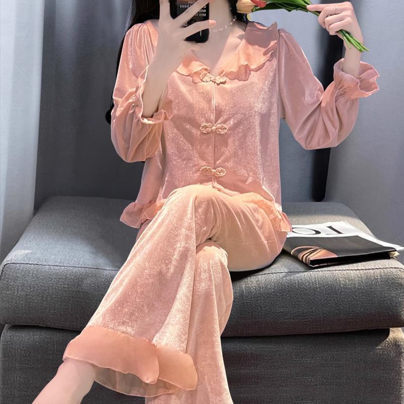 秋冬の新型の金のベルベットのパジャマの女性の新しい中国式の国風のバックルのゆったりした大きいサイズの部屋の服のスーツの女性は外出することができます。