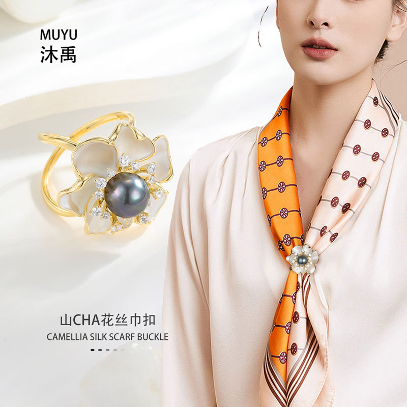 新しいパールシルクスカーフバックル、女性用高級感、シンプルでファッショナブルな椿の花柄ショール装飾、Tシャツベルト固定バックル