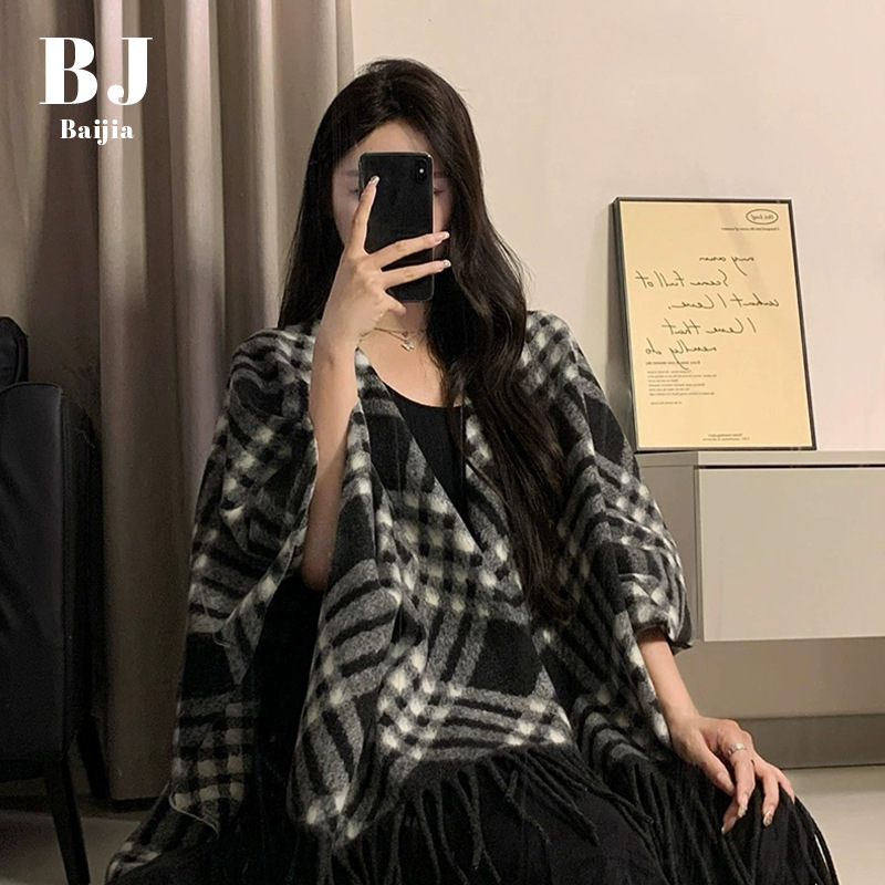 菱形格子仿羊绒围巾披肩女秋冬季时尚百搭保暖围巾加厚流苏大披风