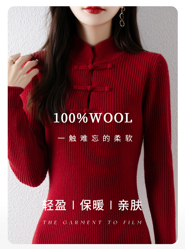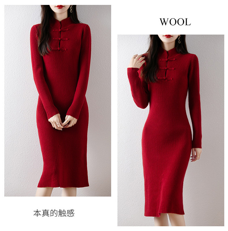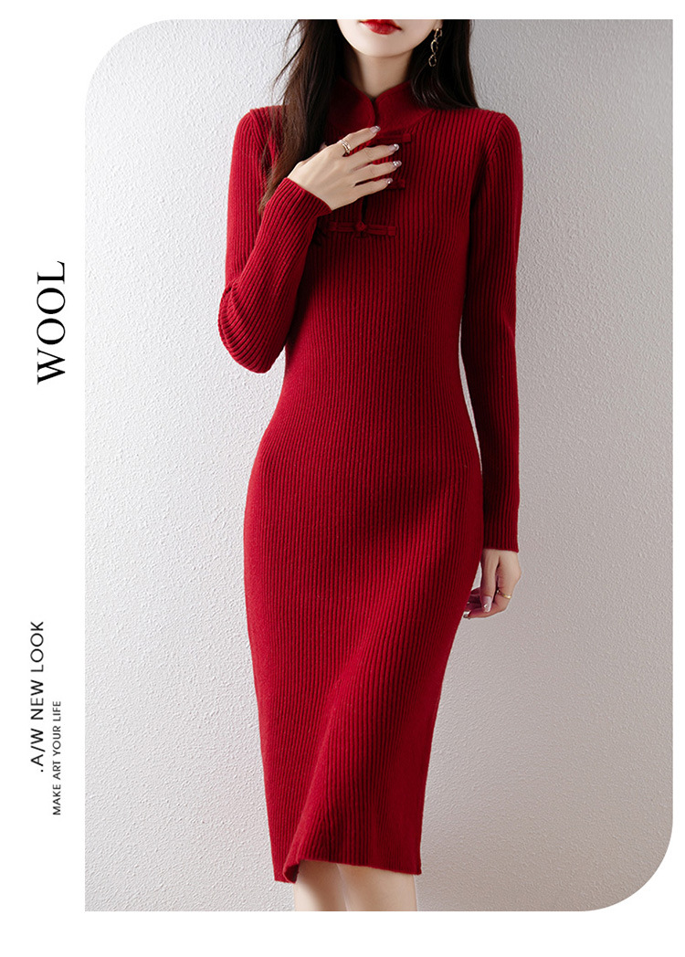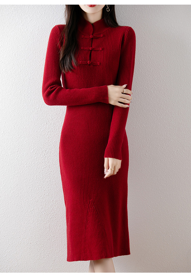 2024秋冬新中式针织连衣裙长裙修身羊绒毛衣打底裙秋冬红色旗袍裙