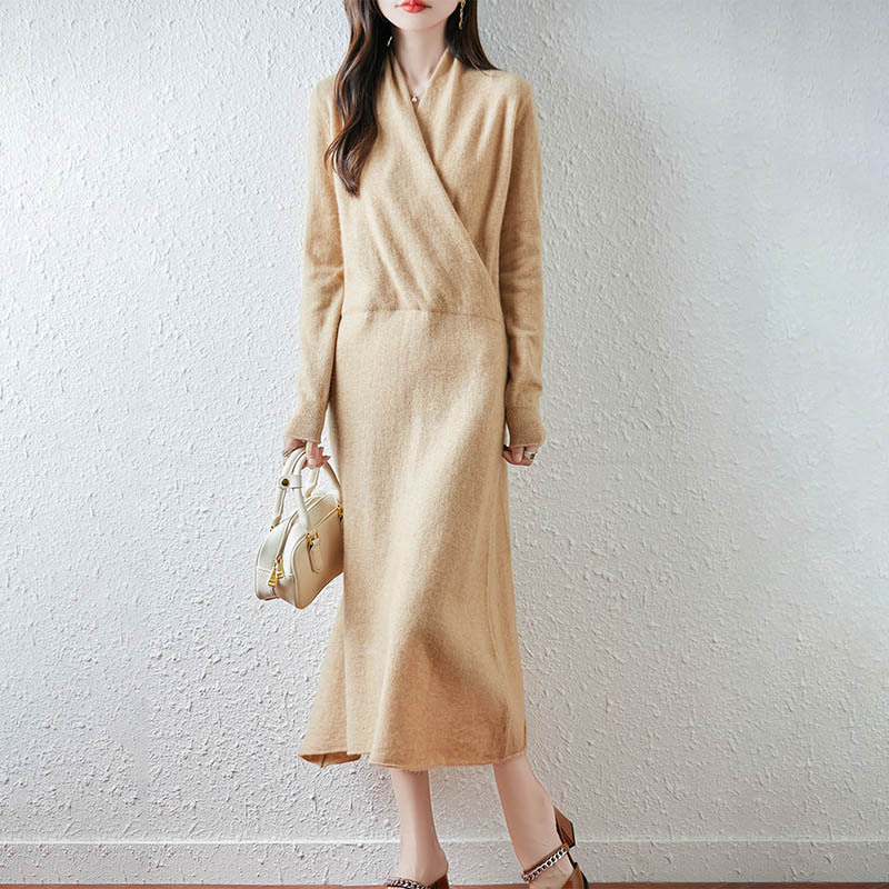 2025秋冬新款V领纯羊毛收腰连衣裙女交叉领毛衣针织裙A字打底麻花