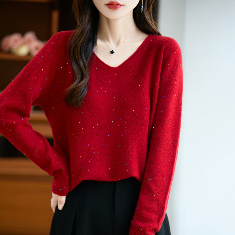 亮片羊毛衫新款100羊毛一线无缝套头针织衫彩片休闲V领毛衣女秋