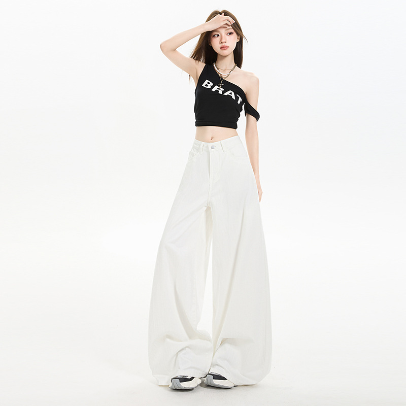 アメリカンレトロな白いルーズワイドレッグパンツ、ドレープフロアレングス、女性用の多用途ストレートジーンズ、春夏の新しいロングパンツ