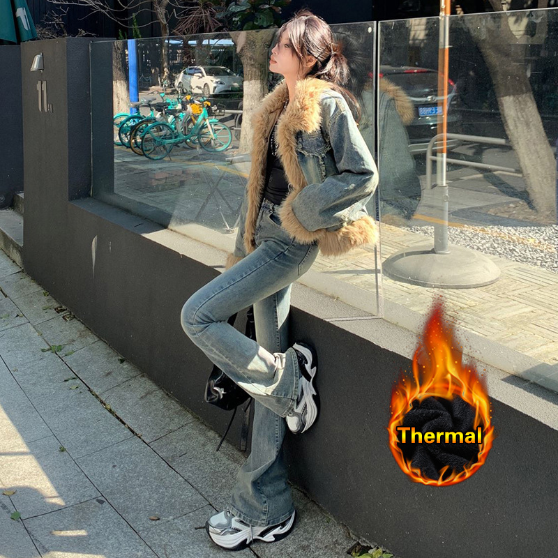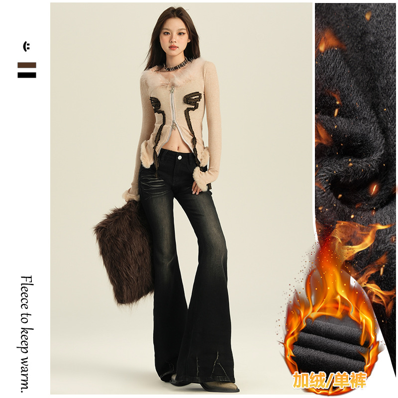 加绒美式复古辣妹低腰百搭修身秋冬喇叭裤牛仔裤女&长裤加长