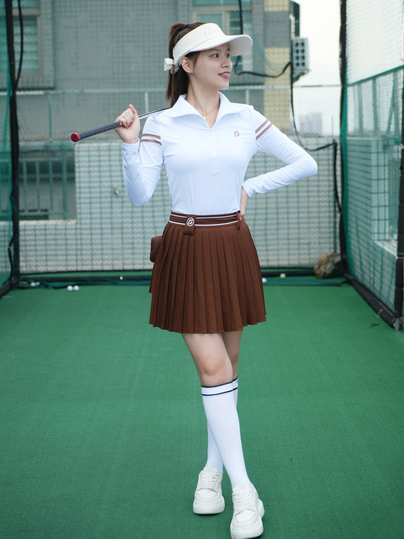 夏の女性ゴルフテニス百シワのスカートは腰が高くて痩せています。