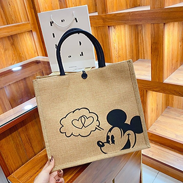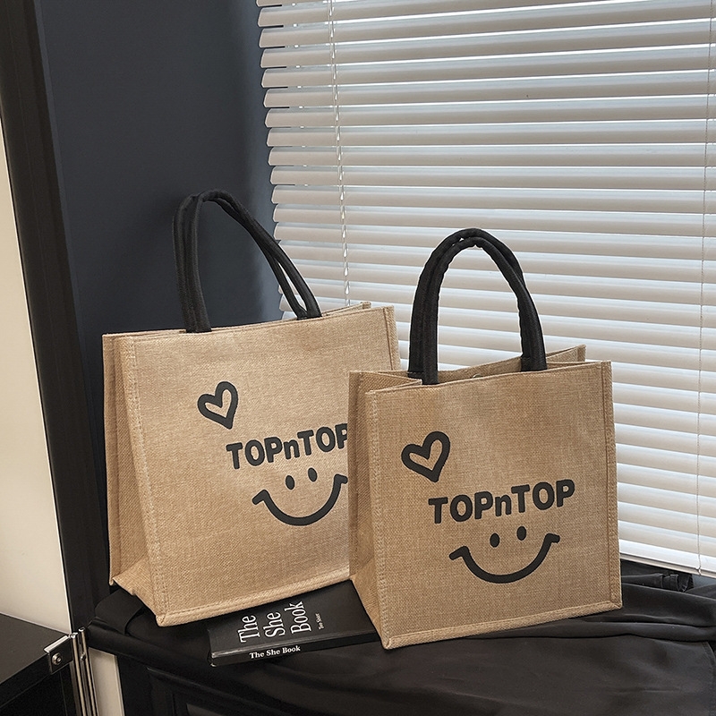 潮流新款手提麻布购物袋 质感通勤大容量便当包印花黄麻手提袋