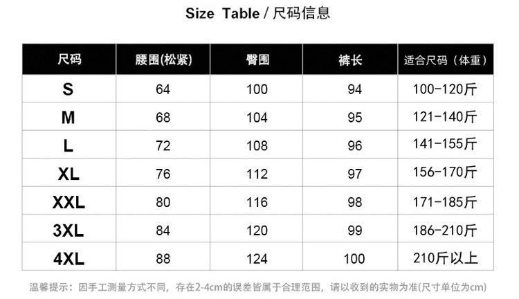S 重量 100— 60kg,M 体重 121— 70kg,L 体重 141— 77.5kg,XL 重量 156— 85kg,2XL 重量 171— 92.5kg,3XL 重量 186— 105kg,4XL 重量210以上
