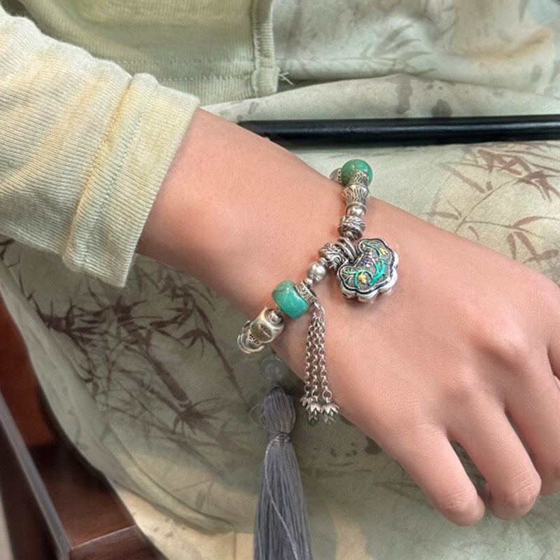 復古風銀珠如意鎖サイコロ竹節松石手串鎖女小衆新中国式アクセサリー新製品アクセサリー