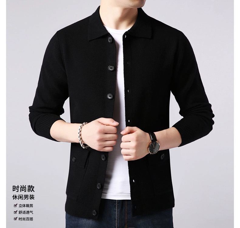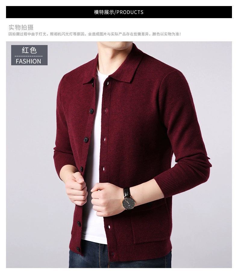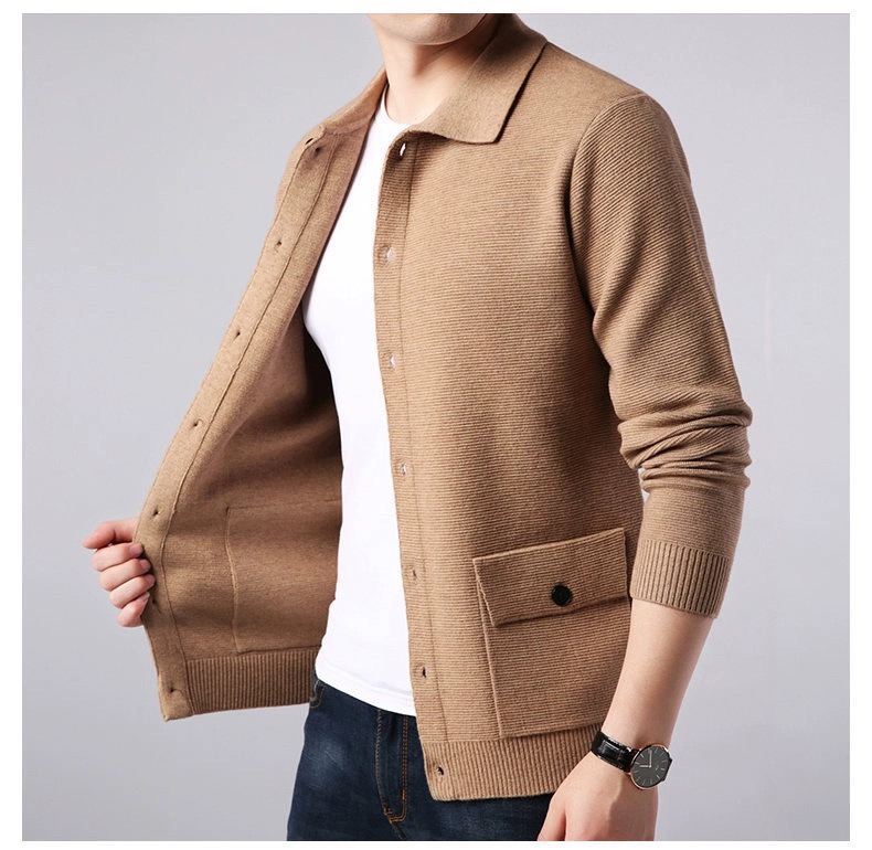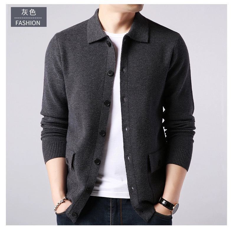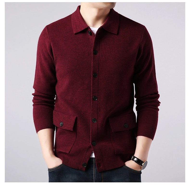 春と秋にカーディガンの男性ニットの襟をめくるコートの薄いボタンのセーターの中年のゆったりしたビジネス服のシャツの襟