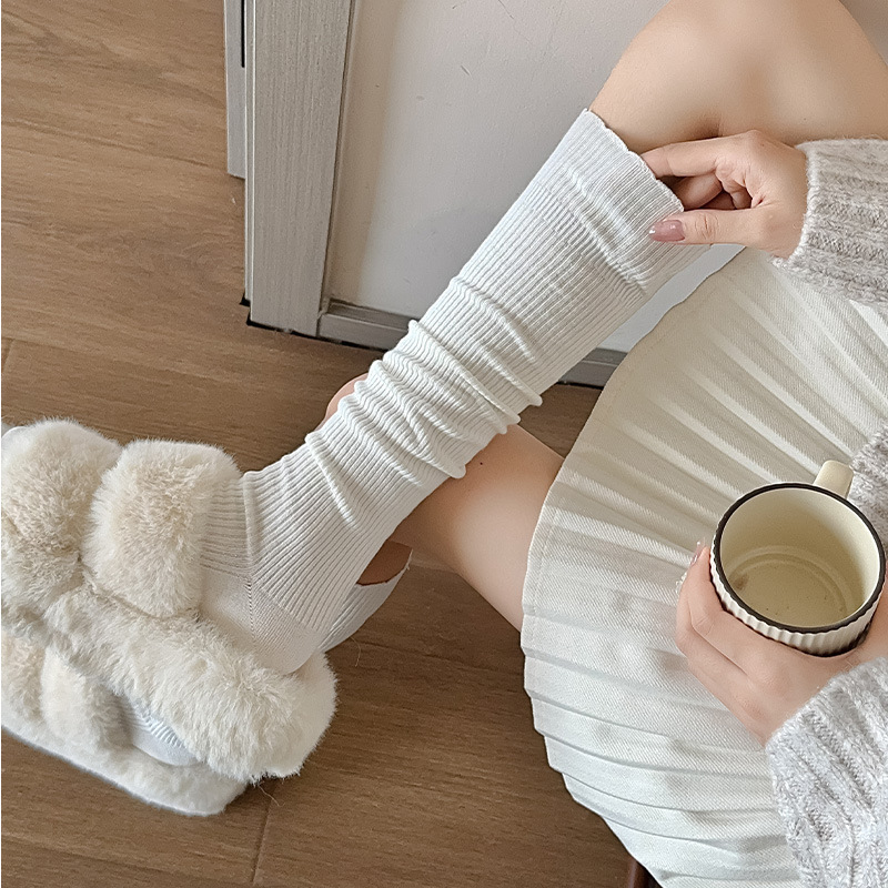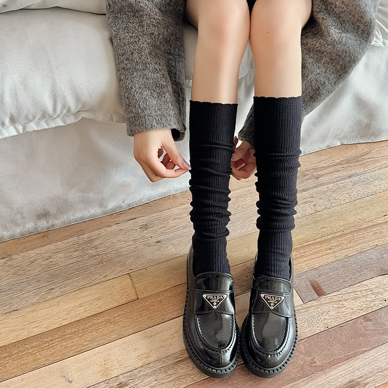 秋冬新款小腿女袜双针精梳棉甜美堆堆袜个性ins纯色木耳边长筒袜