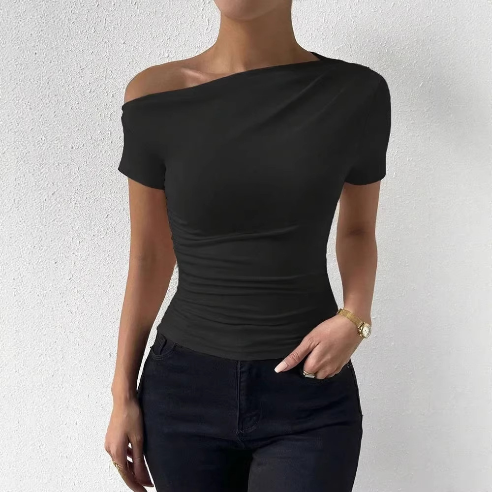 欧美跨境亚马逊独立站春夏新款速卖通修身抽褶不规则短袖T恤上衣