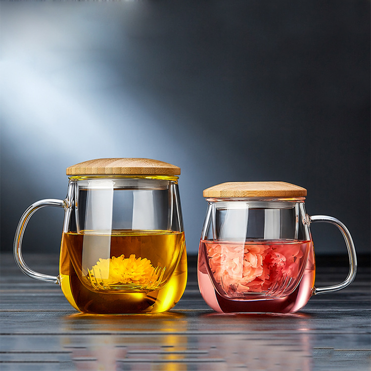 木の蓋の取っ手のガラスの3つの杯の事務室のお茶の分離の泡の杯の高ホウ素のシリコンのガラスの花のお茶の緑の杯