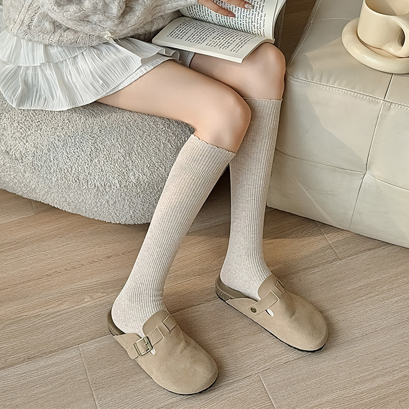 秋冬新款小腿女袜双针精梳棉甜美堆堆袜个性ins纯色木耳边长筒袜