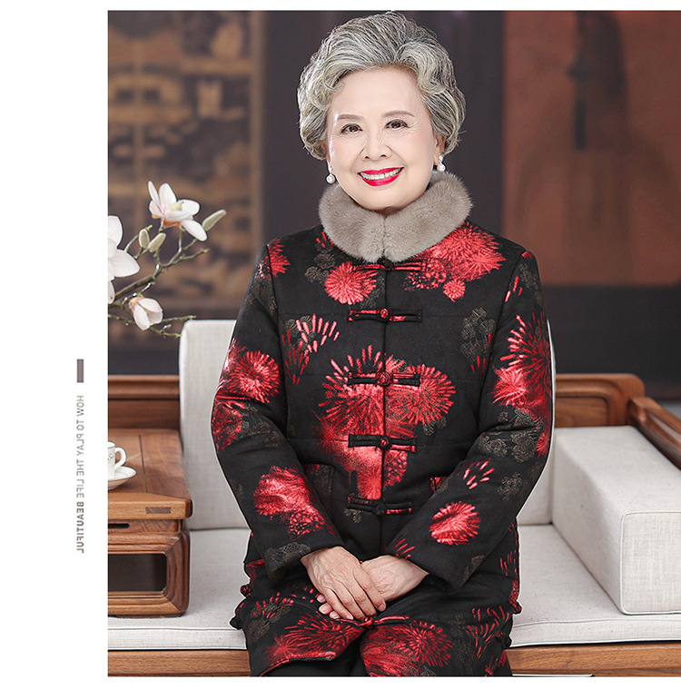 お年寄りのダウンジャケットの女性の短いタイプの本命年のお母さんの冬服の綿入れの上着の老人の唐服のおばあさんの冬の綿入れの上着