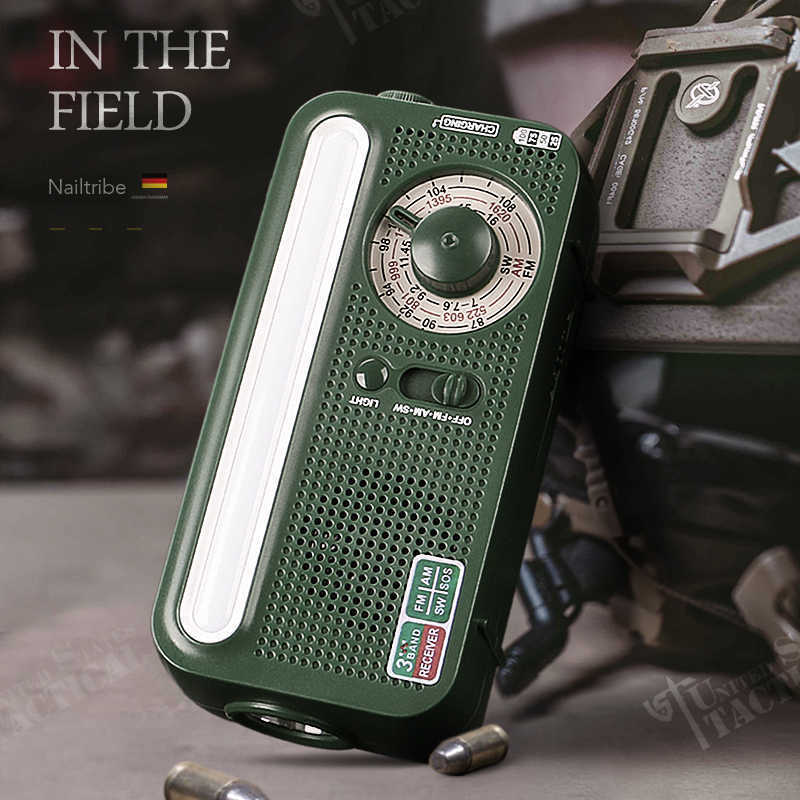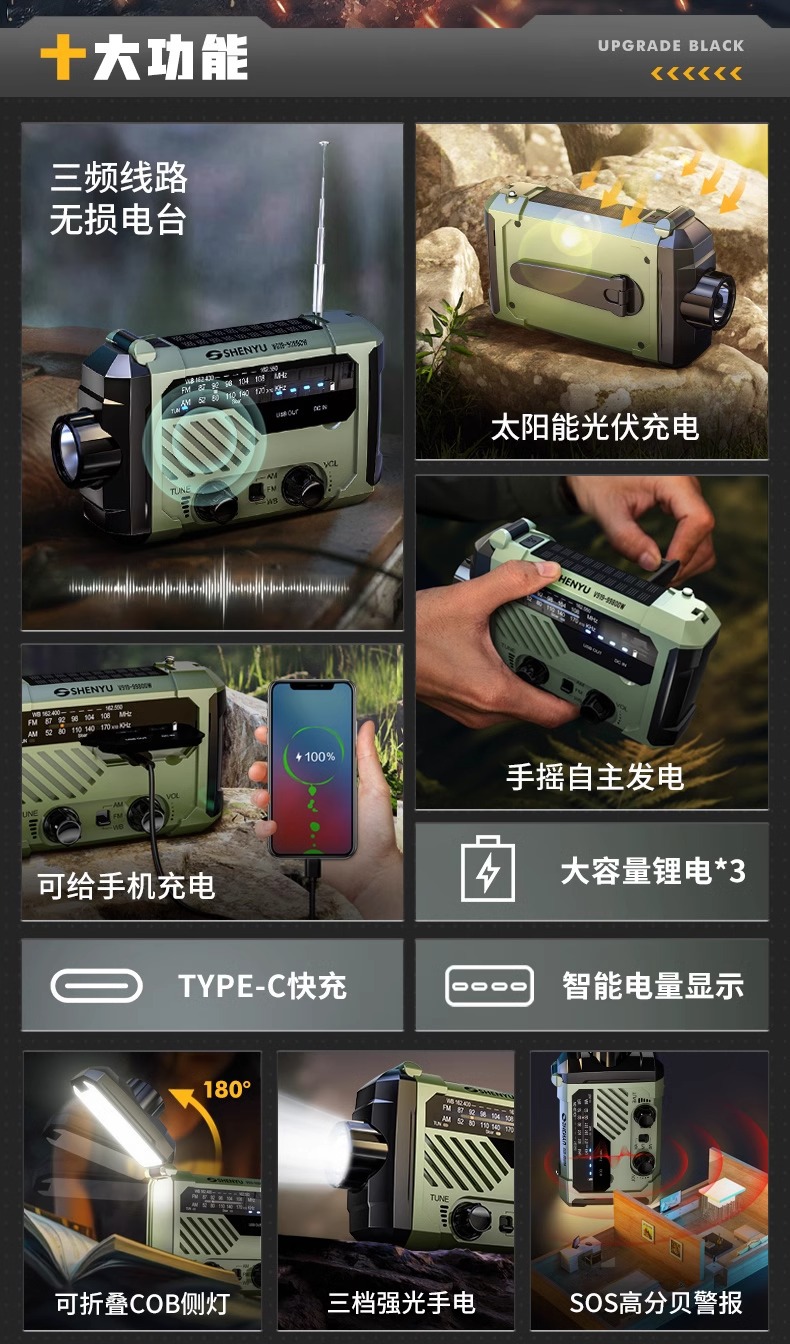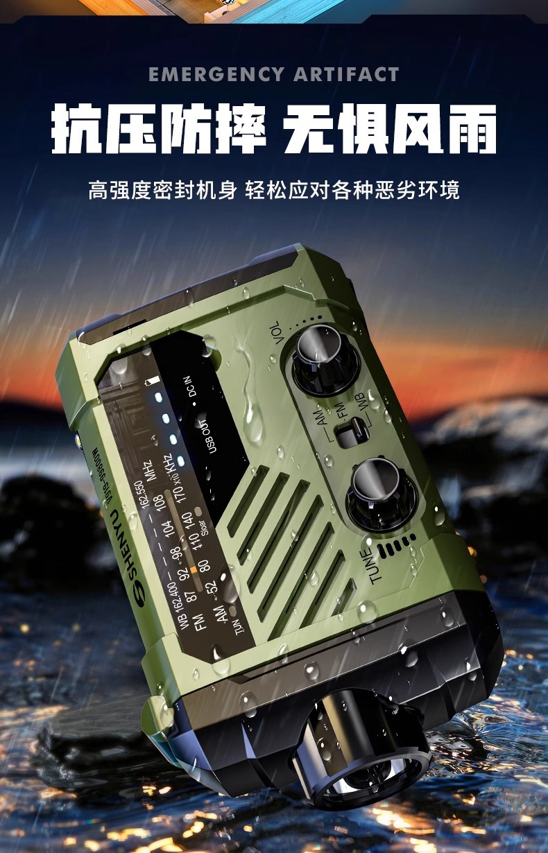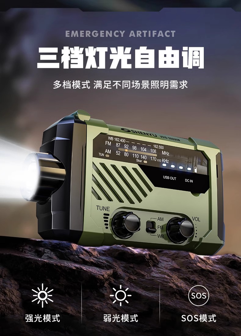 德国应急手摇发电式收音机强光手电筒救灾户外太阳能多功无线电台