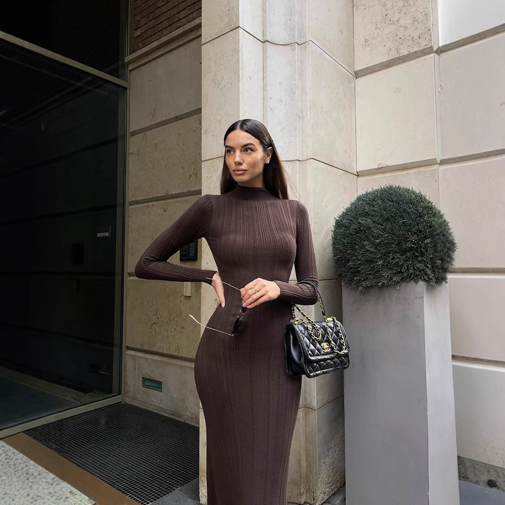 国境を越えた欧米風2024秋の女性ワンピースファッション高襟長袖修身包尻痩せワンピース