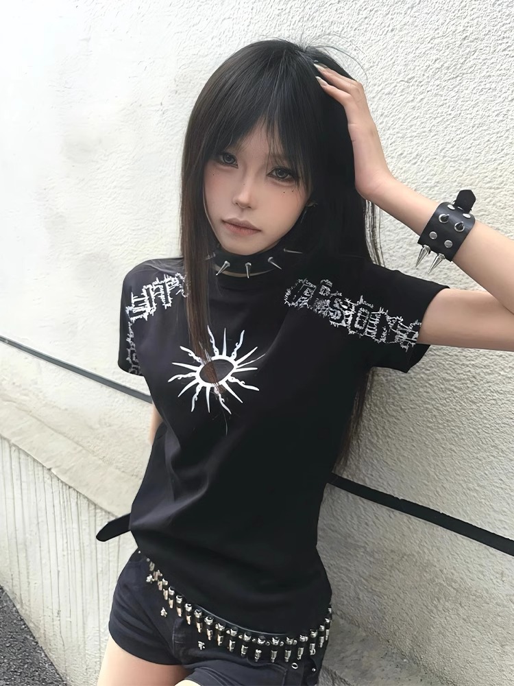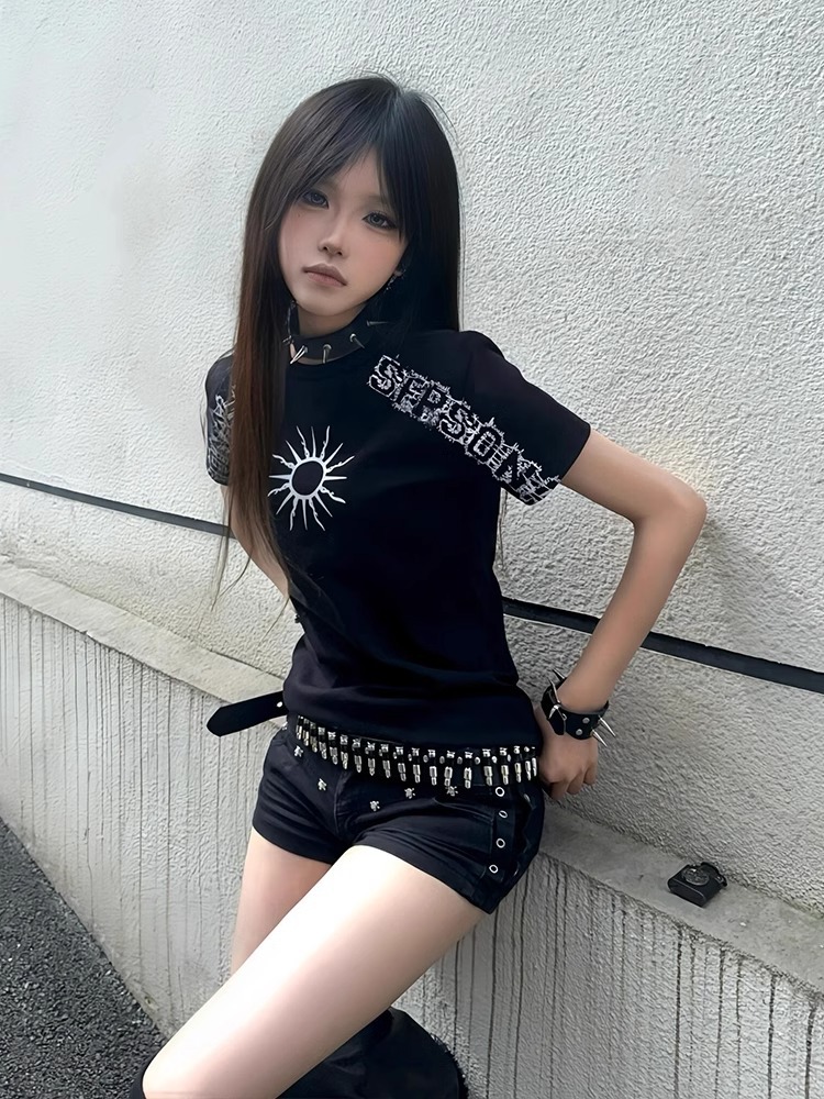亜文化の肩の半袖のtシャツの女性の夏の新型のアメリカの復古のパンクのteeはy2kギャルの上着を修理します。