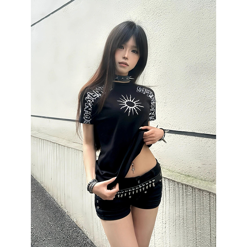 暗黒亜比y 2kの肩の日焼け止めの上着の女性2025夏の新型の亜文化の復古の十字の長袖のtシャツ