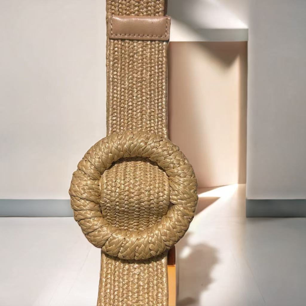 メーカー卸売わら織りレトロ春夏新作手作りボタン弾性ゴムバンド PP 草ベルトマッチングドレス