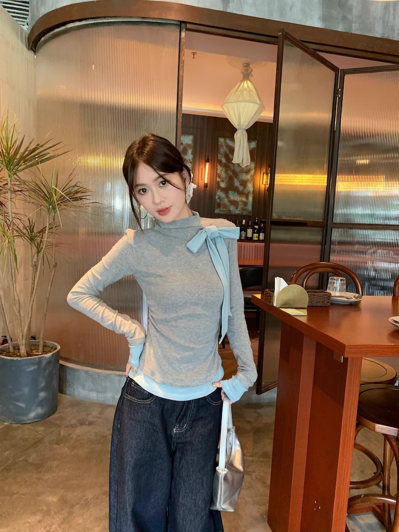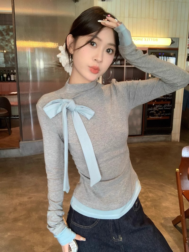 オリジナル品質人綿270グラム) 半高襟tシャツ女性甘いギャルデザイン感シャツ蝶ネクタイ上着