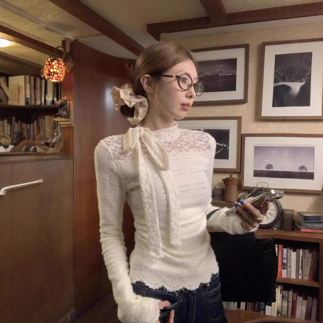 透明な高襟のネットの底のシャツの女性の中で長袖の糸のt2024の新型の洋風の薄い金の中でレースの小さいシャツを掛けます。