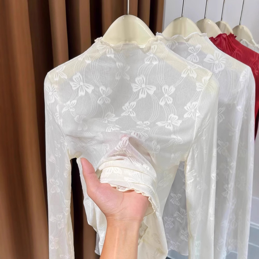 高襟の網の紗の底のシャツの女性の長袖の2024春秋の新型のレースの中で洋風の百合の薄いタイプの透明な上着を掛けます。