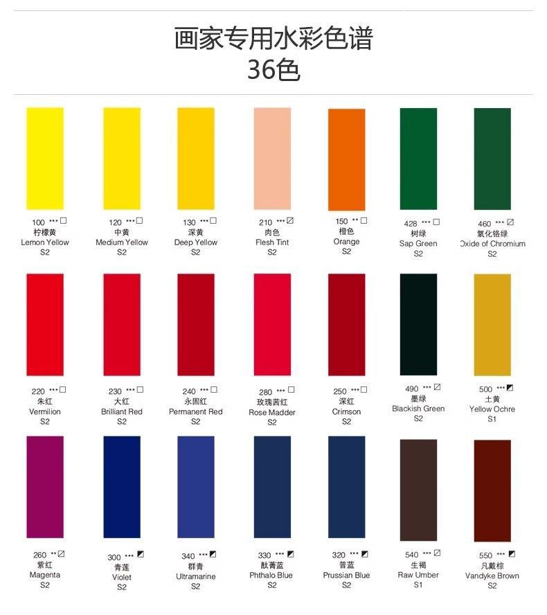 ミディアムイエロー,レモンイエロー,濃い黄色,オレンジ,肌色,朱色,大きな赤,永遠の赤,深紅,紫赤,ローズクリムゾン,清蓮,プーラン,ヤン・チンラン,チョンチン,レイクブルー,スカイブルー,コバルトブルー,エメラルド,永遠のライトグリーン,ツリーグリーン,酸化クロムグリーン,ジェムエメラルドグリーン,アーシーグリーン,オリーブグリーン,深い緑色,アーシーイエロー,アースレッド,熟した,熟した茶色,生の茶色,ファン・ダイ・ブラウン,ペイングレー,カーボンブラック,アイボリーブラック,チャイナホワイト