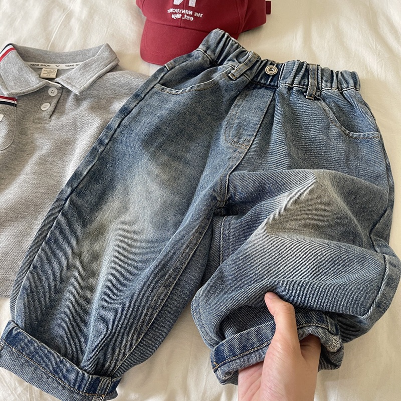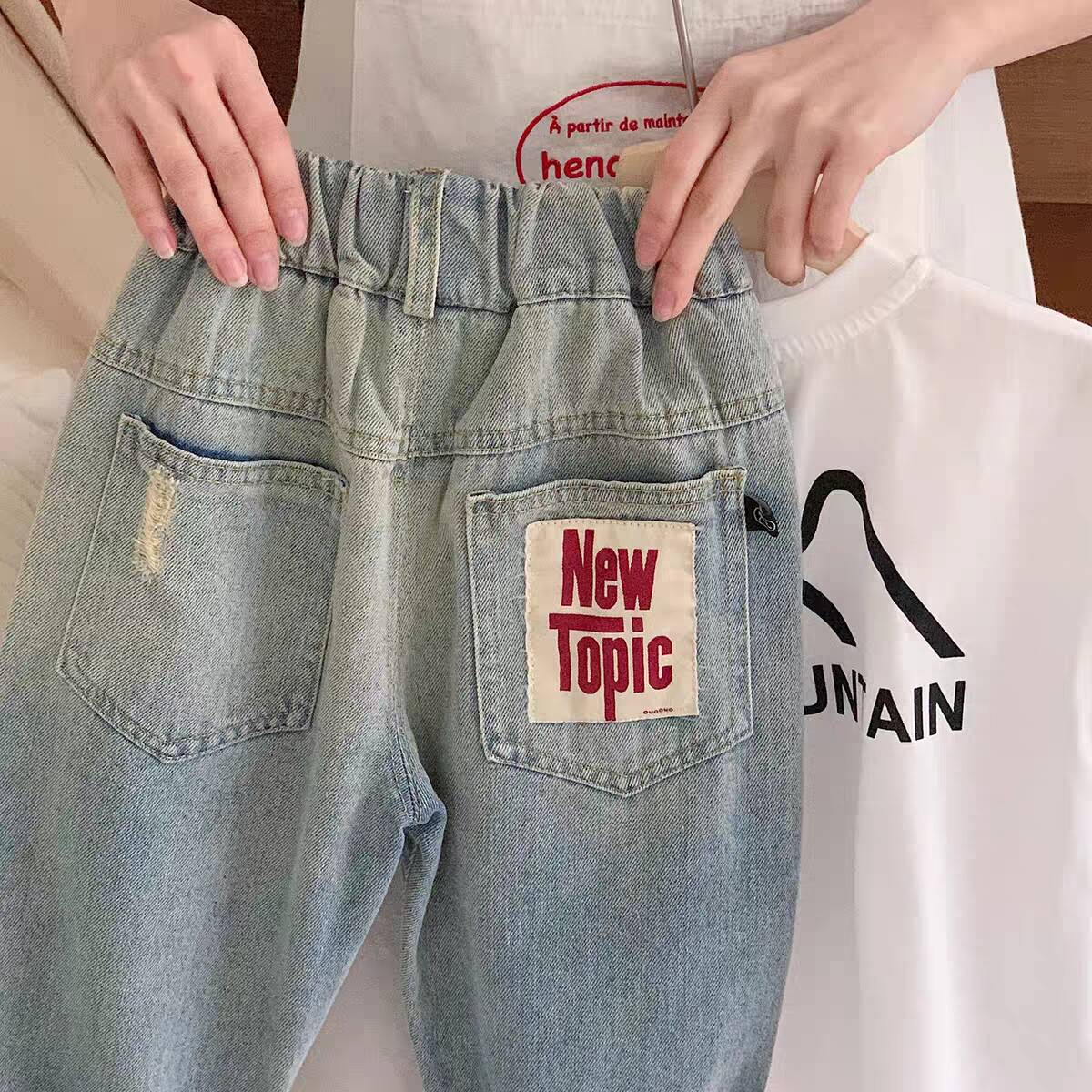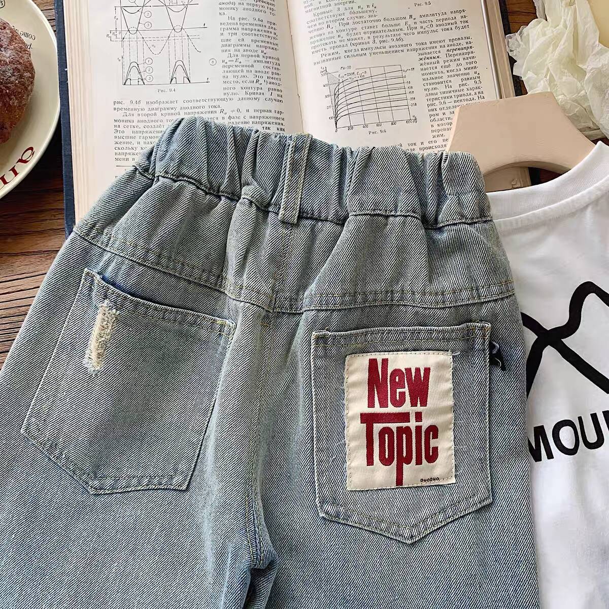 Xiaobu Xiong 2025 春と秋の新子供パンツ子供の韓国スタイルのグラデーションリップドジーンズ男の子と女の子の手紙 9 点パンツ