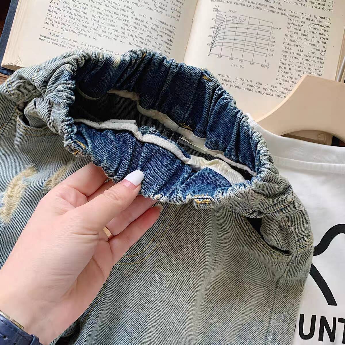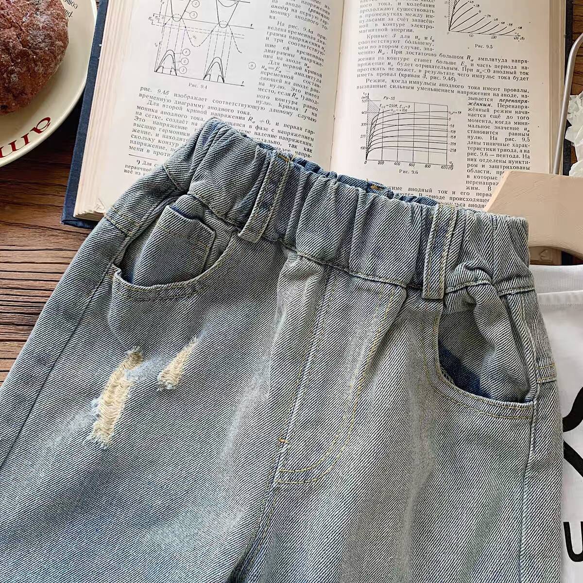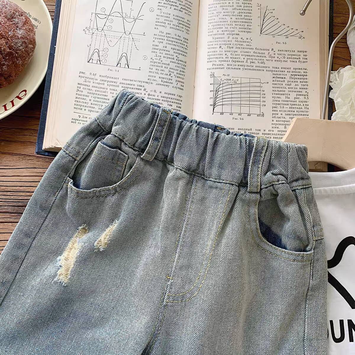 Xiaobu Xiong 2025 春と秋の新子供パンツ子供の韓国スタイルのグラデーションリップドジーンズ男の子と女の子の手紙 9 点パンツ