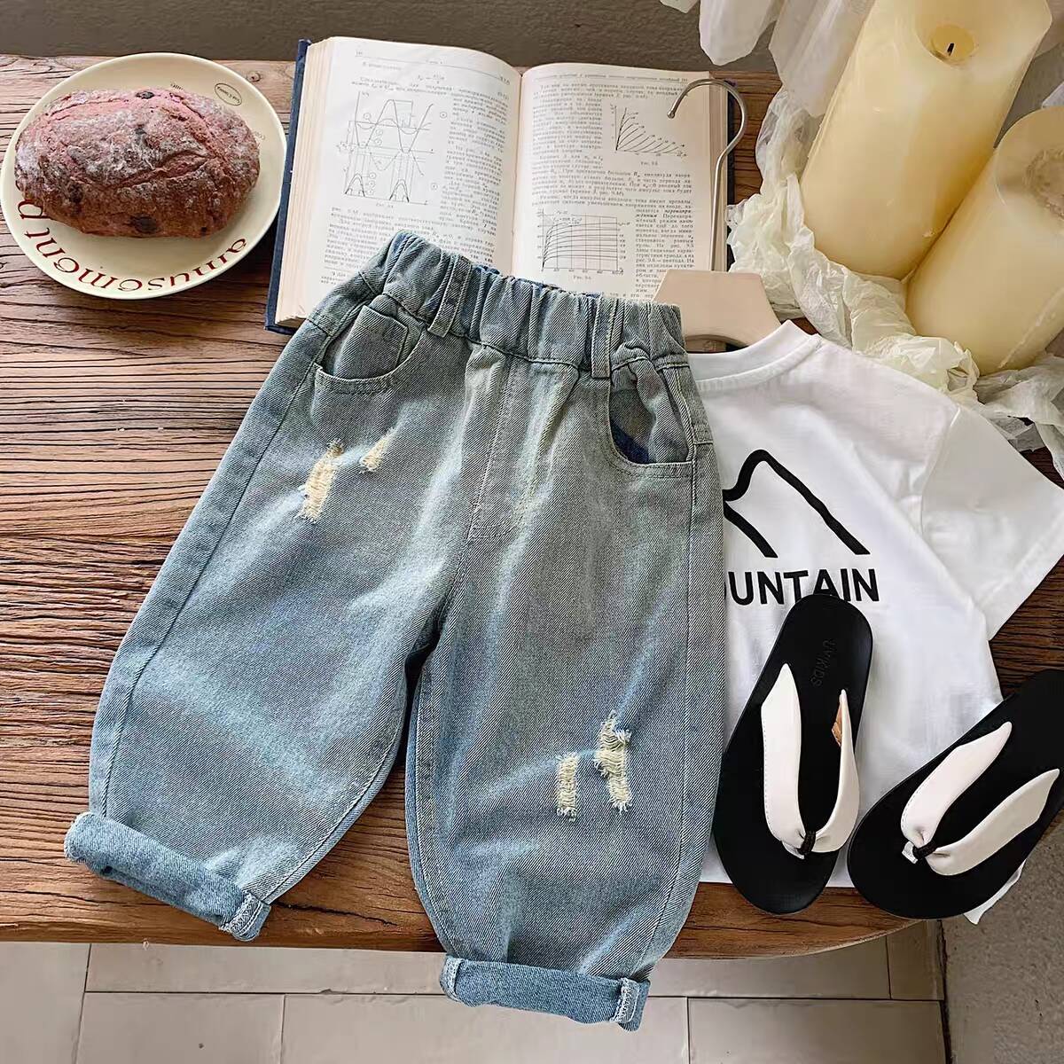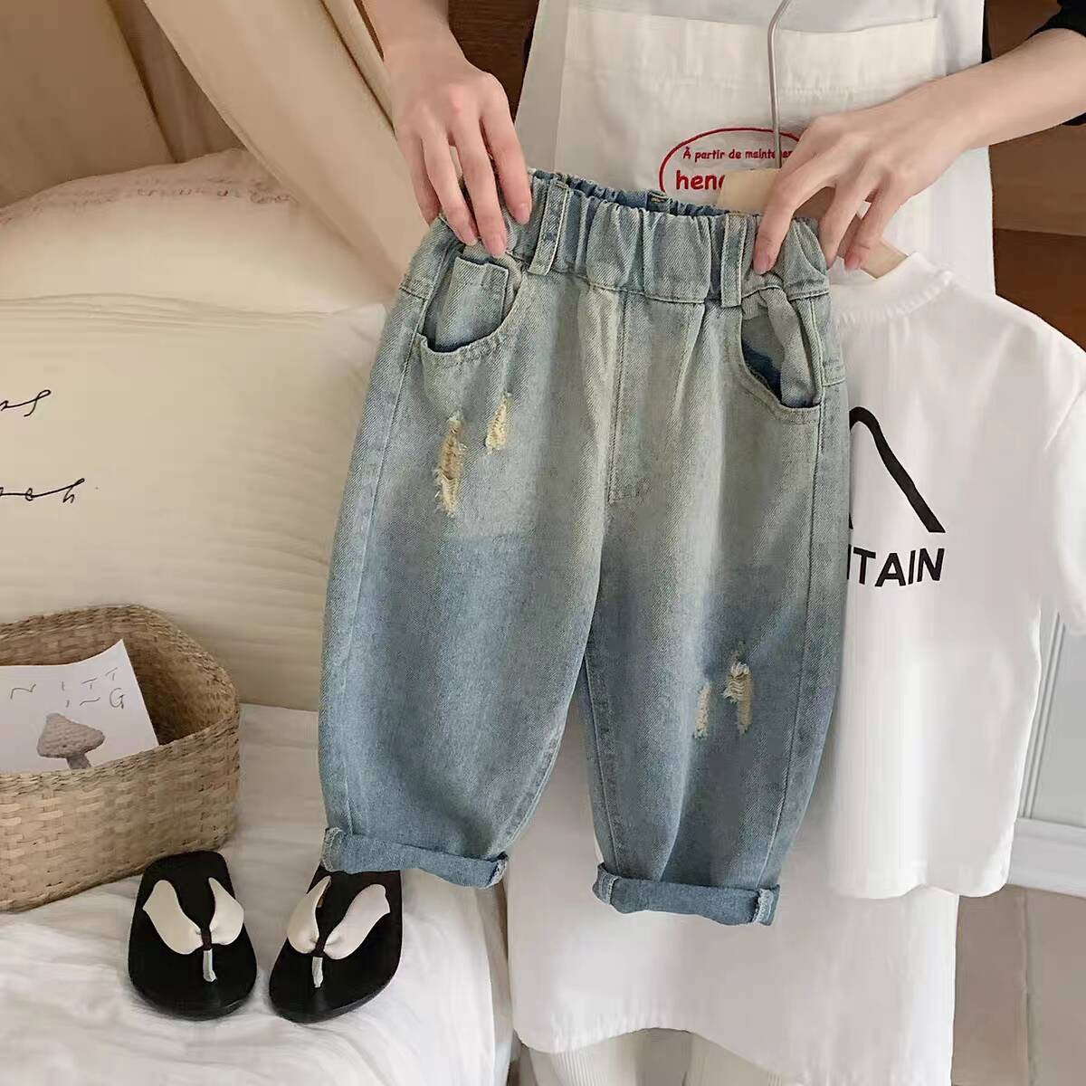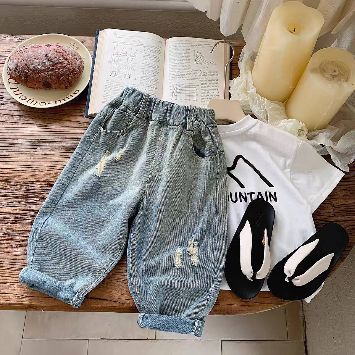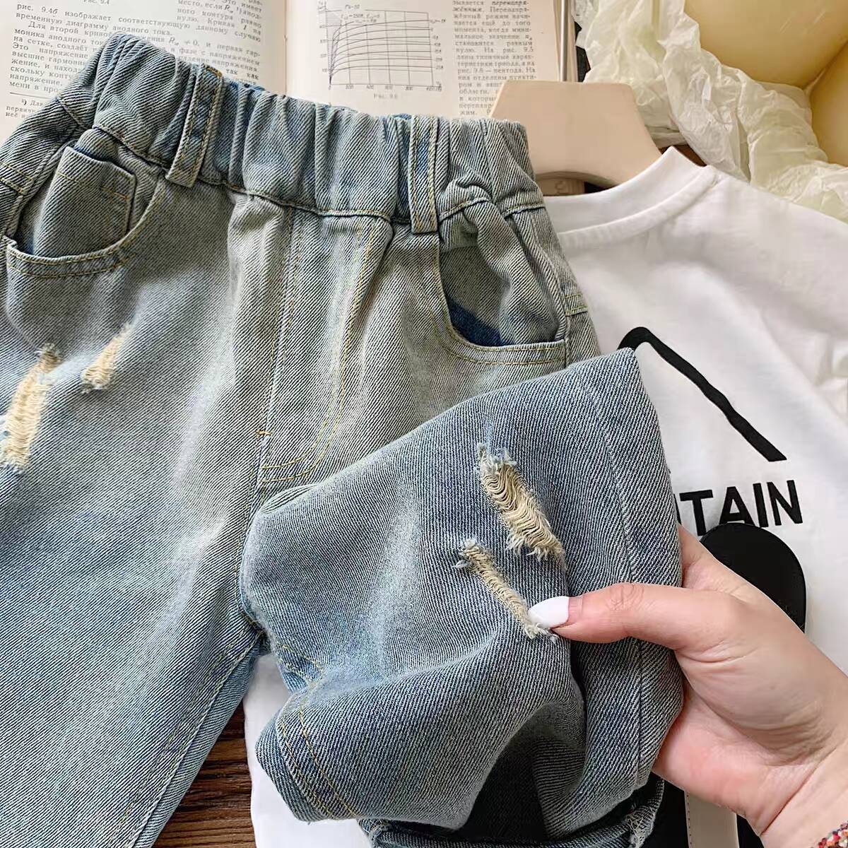 童星円秋の新商品春秋童ズボン子供韓国版グラデーション破れ穴ジーンズ男児九分ズボンファッションブーム