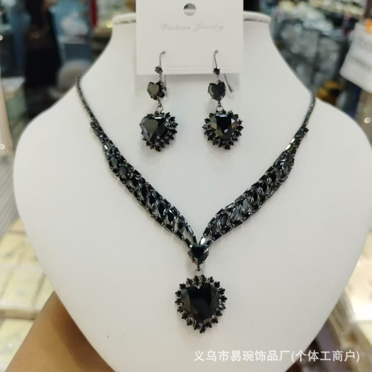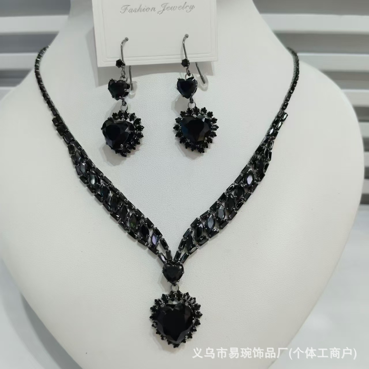 跨境新款重工黑色水晶锆石爱心项链耳环套装时尚高级感贵气锁骨链
