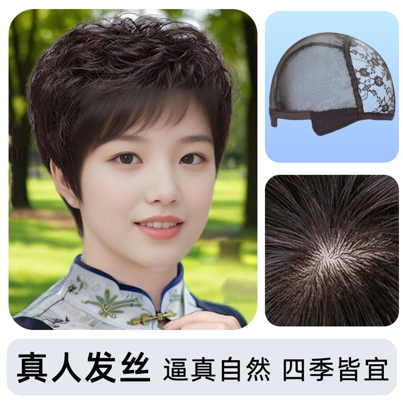 工場直売かつら全頭カバー女性真人髪糸自然短巻きかつらカバー中高年かつら女性真髪