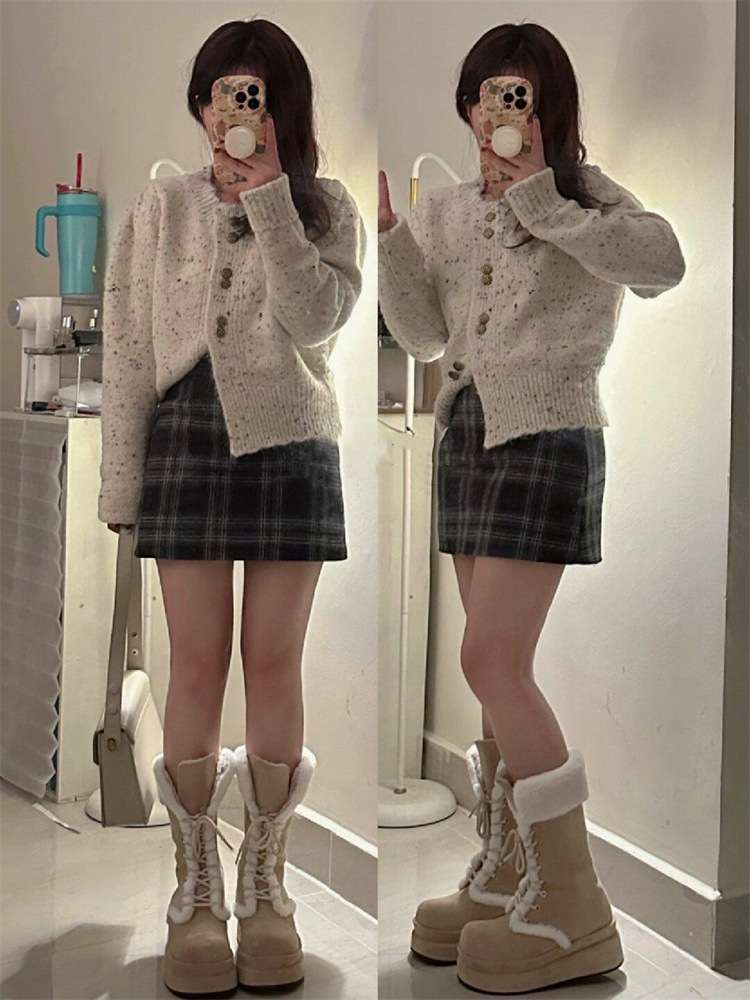 秋冬はグレーの毛を厚くしています。スーツのショートパンツは女性がデザイン感を着ています。