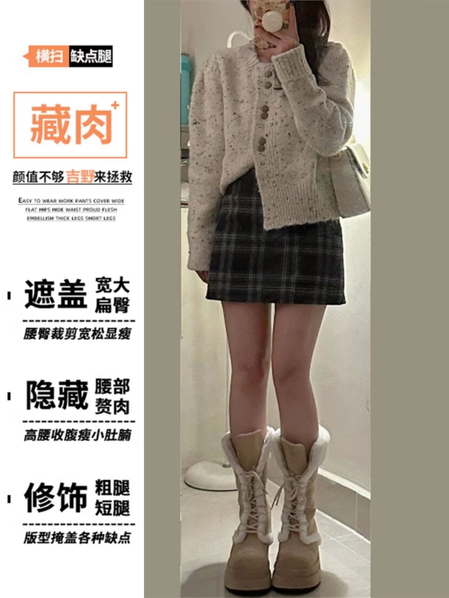 レトロな格子縞の毛の半身のスカートの女性の大きいサイズの秋冬のラシャの百のしわのスカートの太っているmmは腹を遮って光のa字のショートスカートを遮ります。