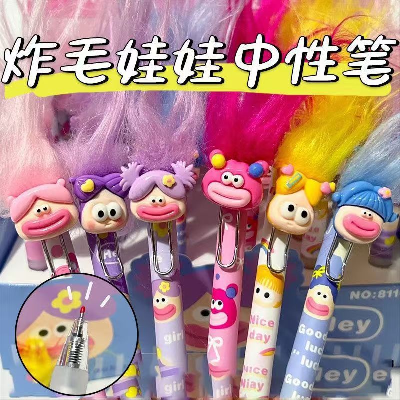 Ins高颜値漫画爆毛金かわいい大口人形押し式中性筆学生は長持ちして黒筆を書く