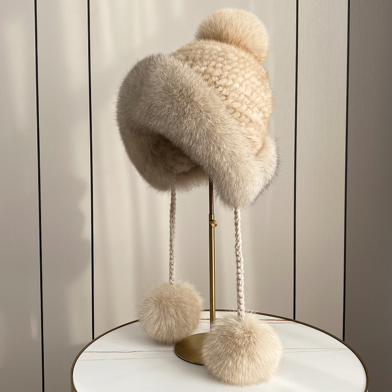新しい冬の暖かいミンクの毛はキツネの毛の耳の毛皮の帽子の女性のかわいい本物のボールの雪の帽子を編みます。